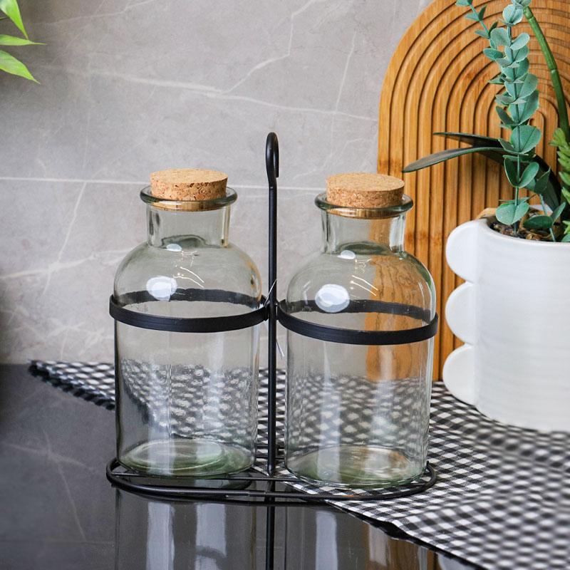 طقم مرتبان زجاج/2 مدور غطاء فلين ستاند معدن اسود JN-15