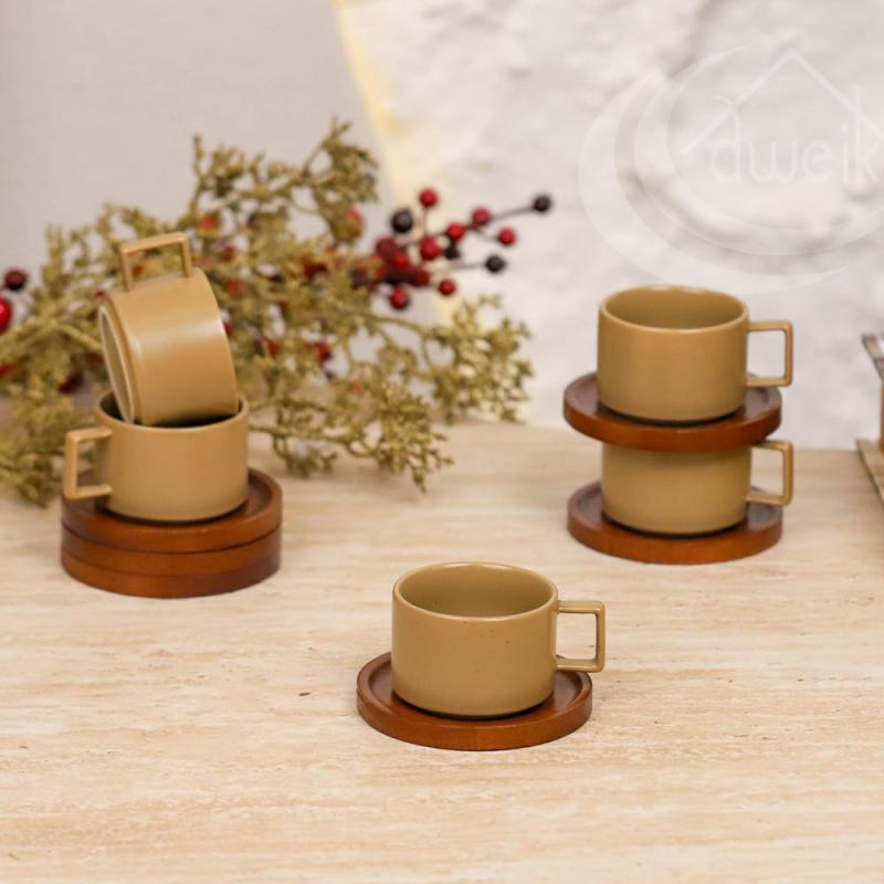 طقم فناجين قهوة 6+6 بورسلان بني منقش صحن خشب YM-241013-90-G