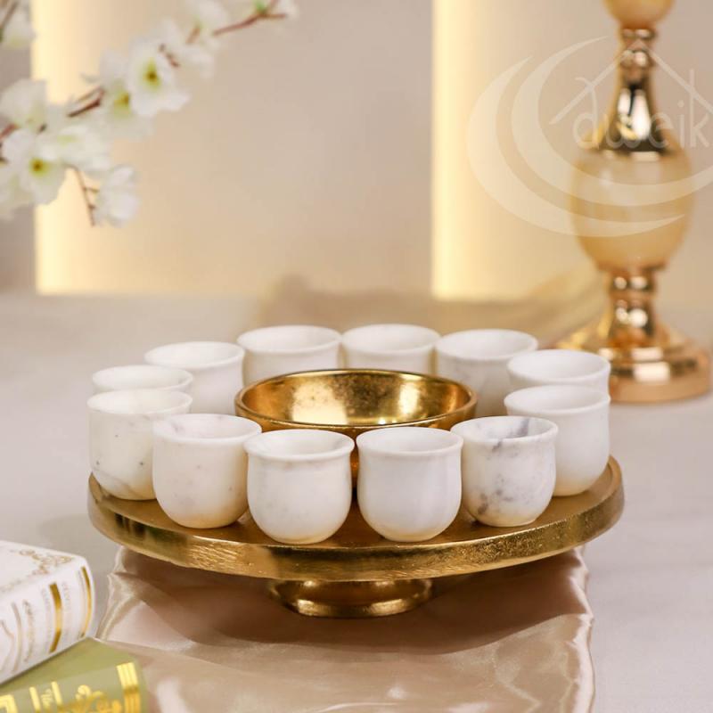 طقم جاط نحاس هندي بقاعدة 30سم + صحن ضيافة مدور 15سم + 12 فنجان رخام هندي D336