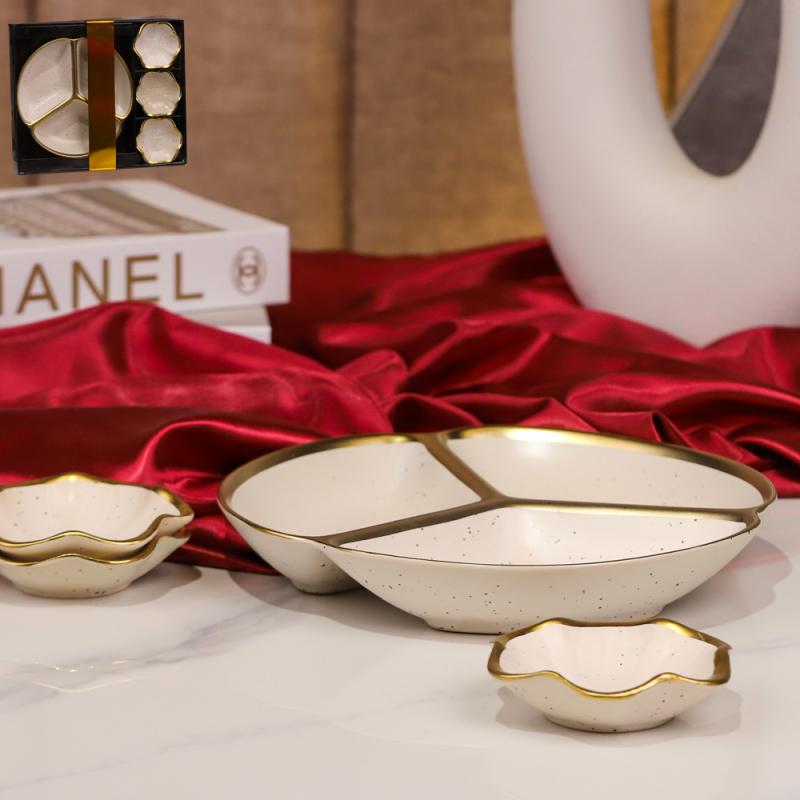 طقم /4 جاط ضيافة مدور مقسم + 3 صحون مكسرات بورسلان بيج منقط حز ذهبي BGP1-3